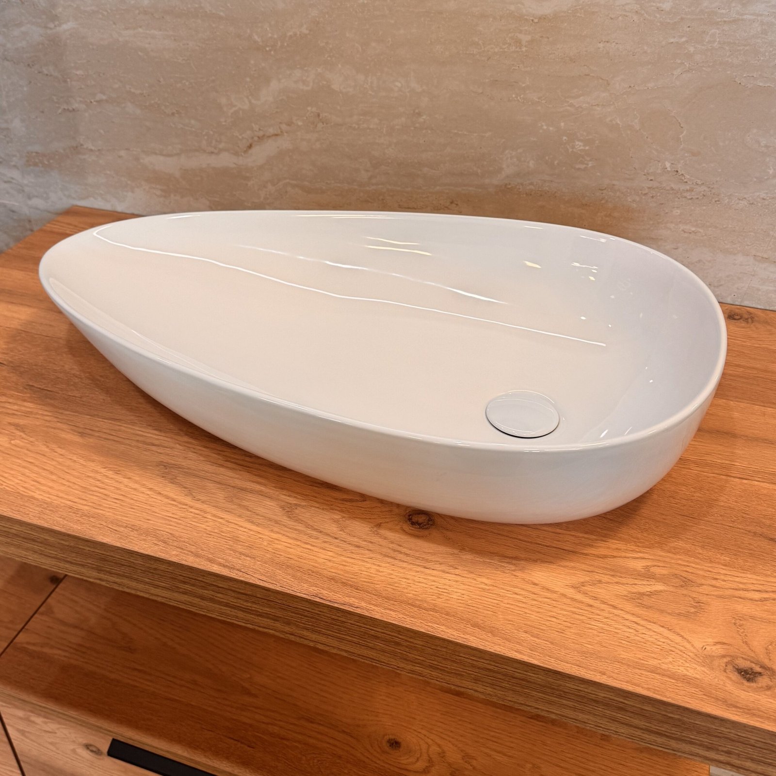Ceramic countertop washbasin features a distinctive shape that subtly elevates the bathroom space. Its unique form creates a recognizable visual statement while maintaining a sense of balance and lightness. Crafted from high-quality ceramic with a smooth, glossy surface, it ensures easy maintenance and a consistently clean appearance over time. Thoughtfully balanced proportions provide comfortable everyday use, while the white finish enhances brightness and visual clarity.
